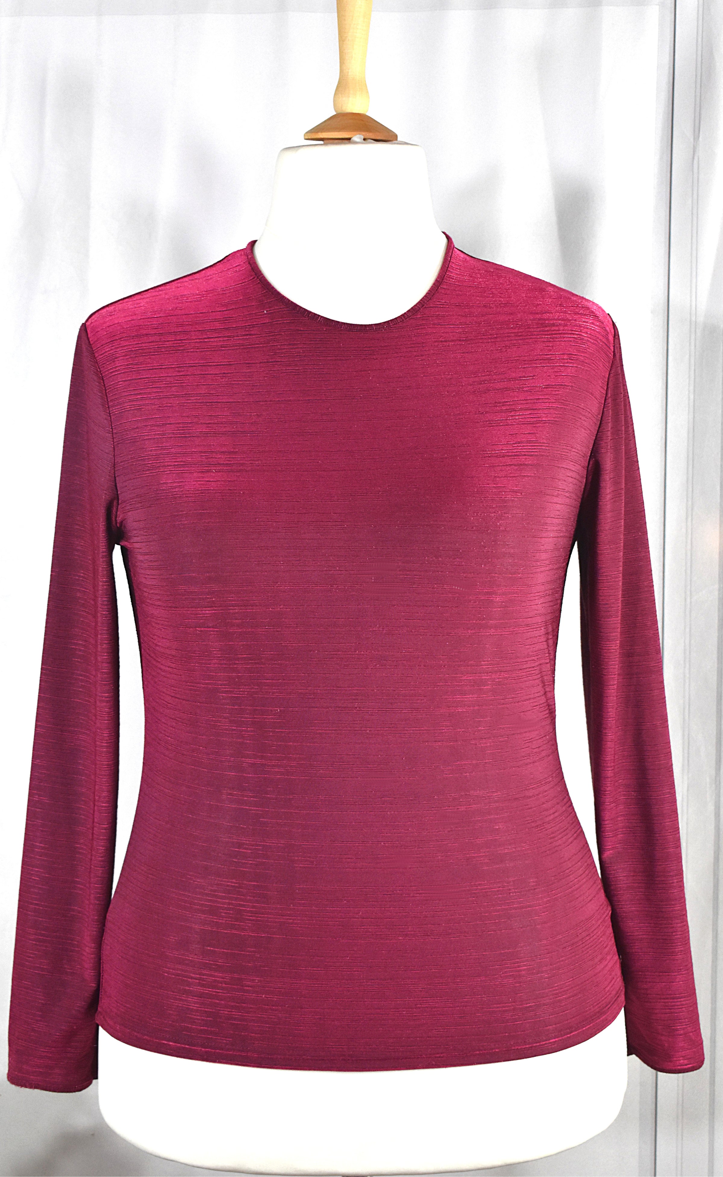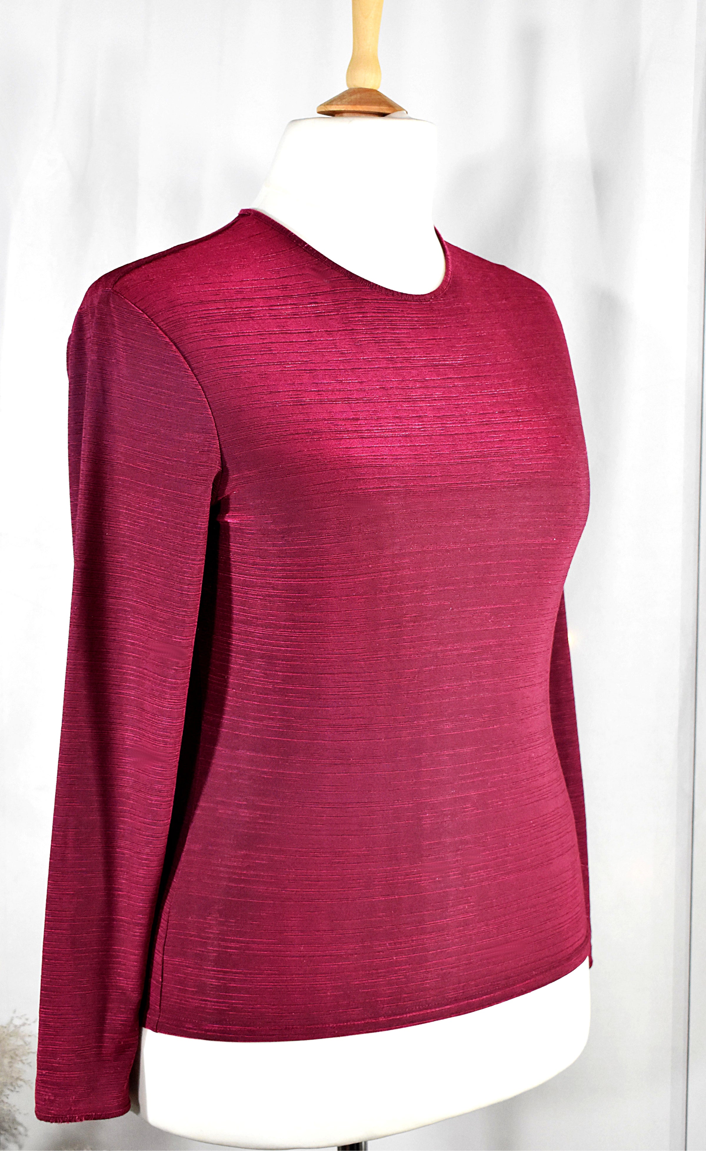 Un joli haut stretch signé Caroll, dans une belle teinte bordeaux lamé profonde légèrement satinée, qui capte la lumière avec subtilité. Il a été fabriqué en France.
