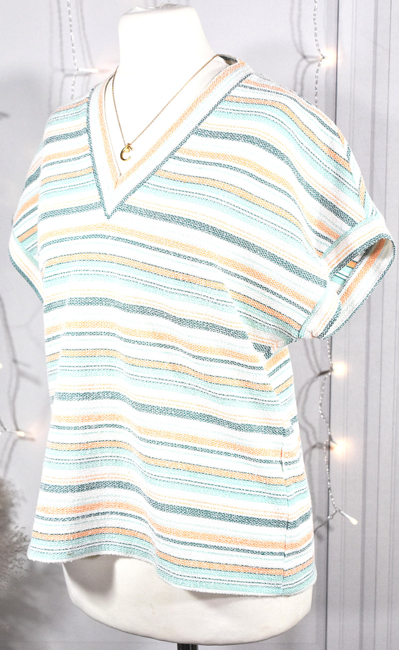 T-shirt texturé aux rayures turquoises & oranges