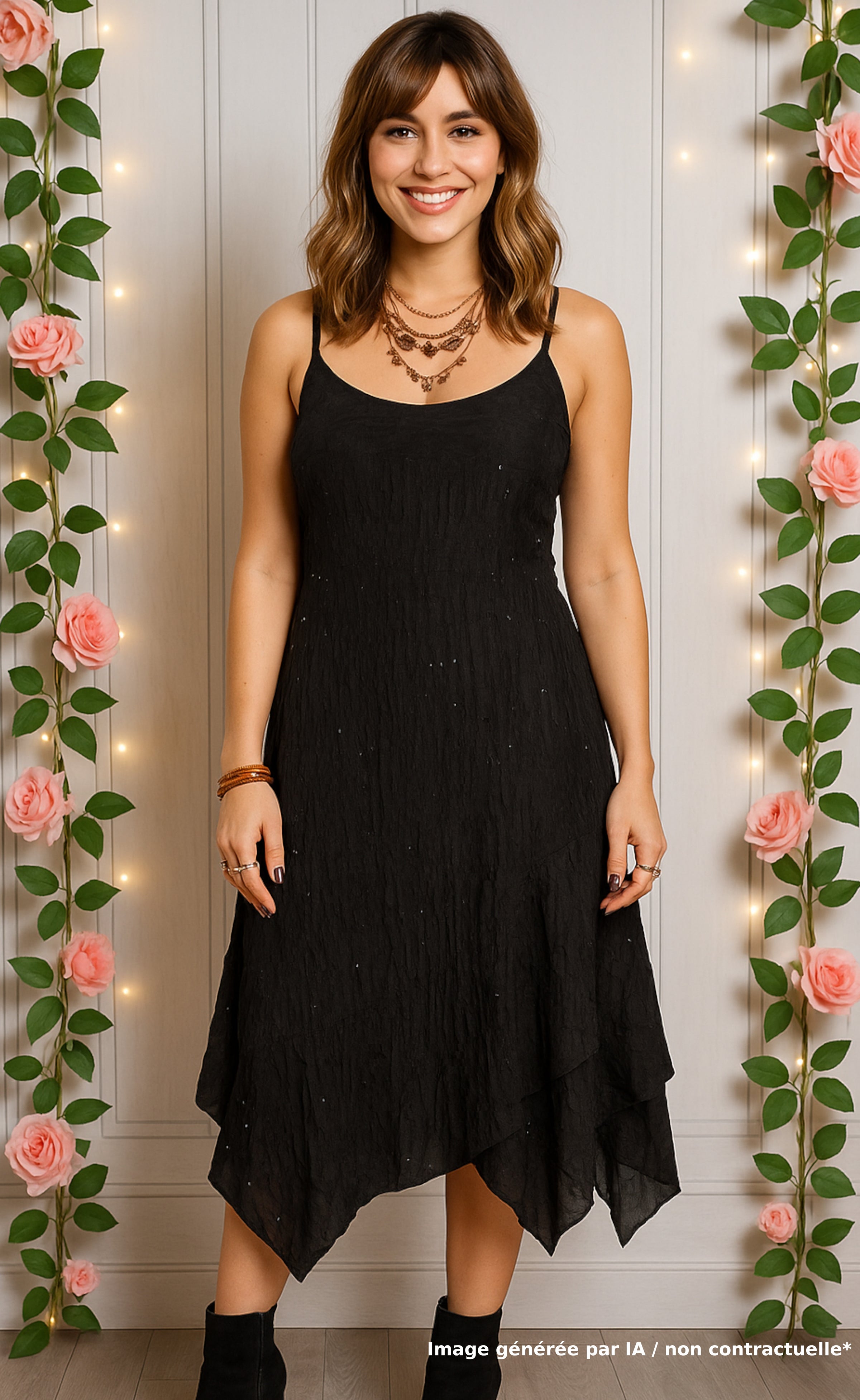 Cette robe de couleur noire, possède de fines bretelles réglables et une encolure arrondie.